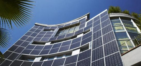 建築物向陽立面若設置太陽能光電板,除具備發電效益外,也能減少陽光直射室內、降低室內溫度;內政部建築研究所更進一步透過彩繪型立面光電設計,降低折射對環境與景觀的影響。